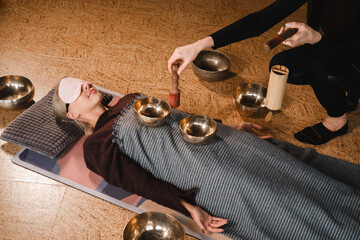 Lorsque les bols sont posés sur une partie du corps, les ondes vibratoires vont se propager dans tous les tissus, notamment grâce à l’eau contenue dans nos cellules. La vibration sonore va permettre ainsi à l’énergie de passer des zones saturées aux zones carencées et réciproquement permettant ainsi de restaurer l’équilibre. Au cours d’une séance, il n’est pas alors tant question d’écouter le son du bol que de se laisser pénétrer par les vibrations émises par celui-ci.